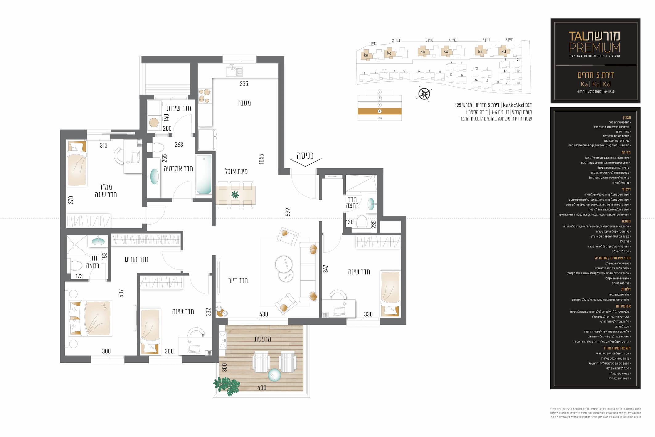 הפרויקט מתוכנן כ"שכונה בתוך שכונה" עם כניסה ויציאה פרטית מהציר המרכזי PREMIUM מורשת של אינטימיות ופרטיות אל חניות הפרויקט. כחלק מתפיסת הבוטיק של פרויקט מורשת טל פרימיום, הבניינים האינטימיים יציעו פרטיות גבוהה לכל דירה. הבניינים יבנו במפרט פרימיום והפרויקט כולו יבנה בבניה ירוקה עפ"י תקן בניה 5282 עם מערכת חשמל חכם לחיסכון באנרגיה ובמים. הפרויקט יכלול בנוסף גם חיפוי פנים וחוץ איכותי, אדריכלות נוף הכוללת תאורה מעוצבת, חניון מקורה ומרווח ולובי מפואר ומעוצב בקפידה בעל חלל כפול.