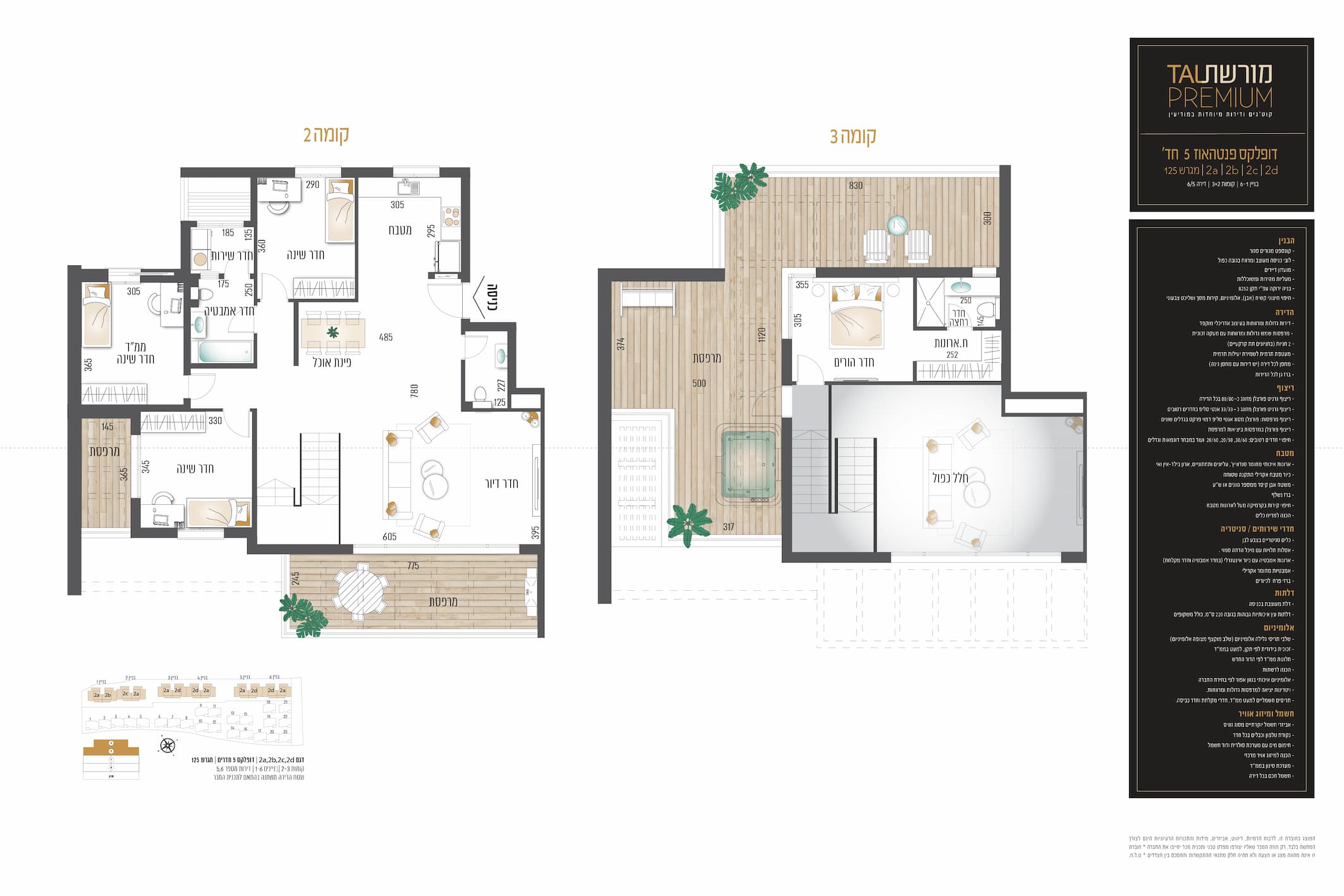 בקומות ב'-ג': שני דופלקס-פנטהאוז עם חלל כפול בין הקומות ומרפסות גדולות במיוחד.