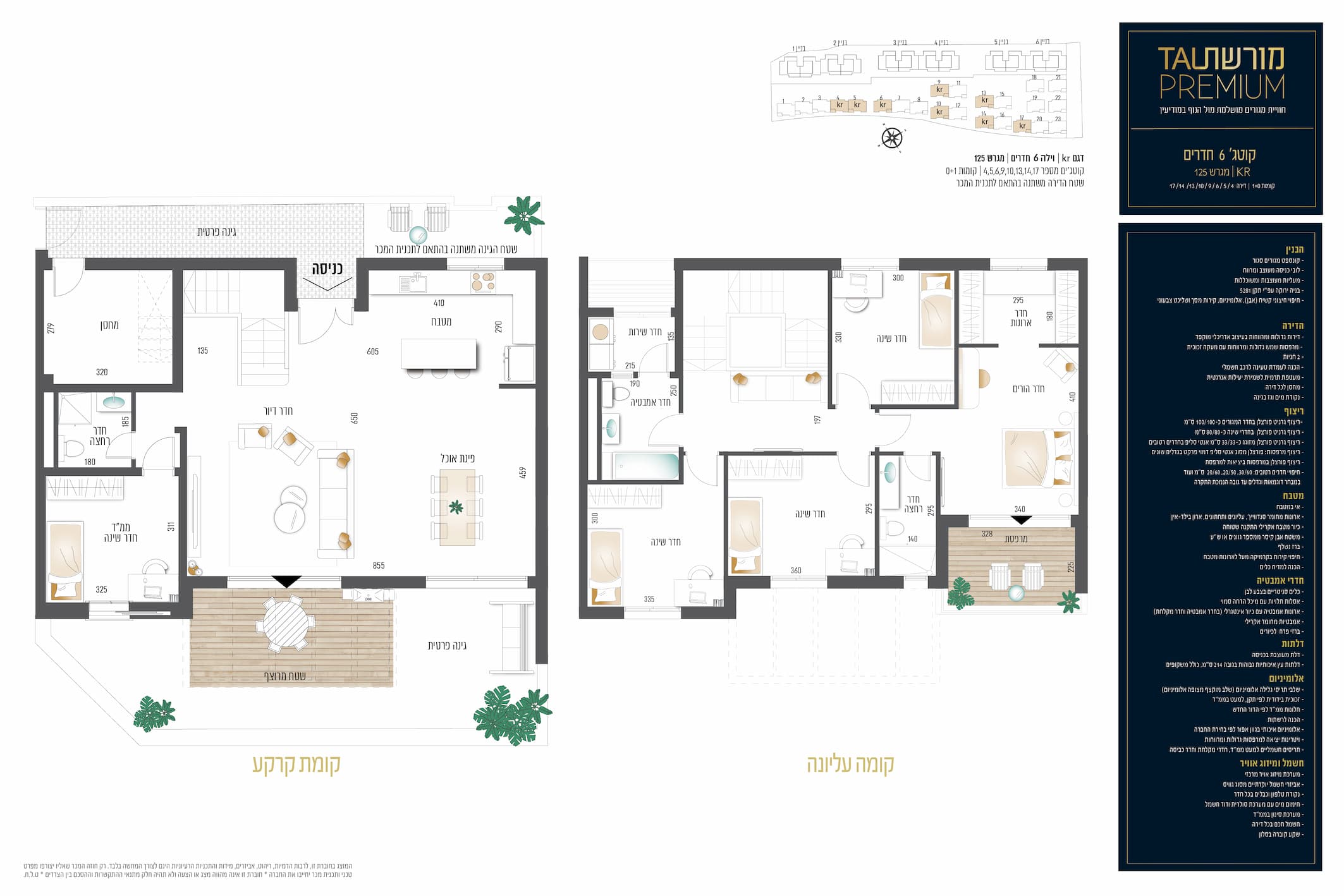 מערכת מיזוג אויר מרכזי אביזרי חשמל יוקרתיים מסוג גוויס נקודת טלפון וכבלים בכל חדר חימום מים עם מערכת סולרית ודוד חשמל מערכת סינון בממ"ד חשמל חכם בכל דירה שקע קוברה בסלון